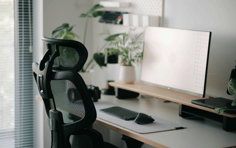 Typically, people are happier outside so placing your workstation near a window and bringing in houseplants will help by providing natural light, and greenery resulting in greater productivity, increasing our moods, easing eye strain, and even help contribute to improved sleep cycles.